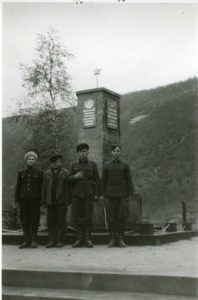 Bilde: Juni 1945. Foto av fire tidligere fanger foran den nybygde minnestøtten i Beisfjord. Foto fra T. Furunes.